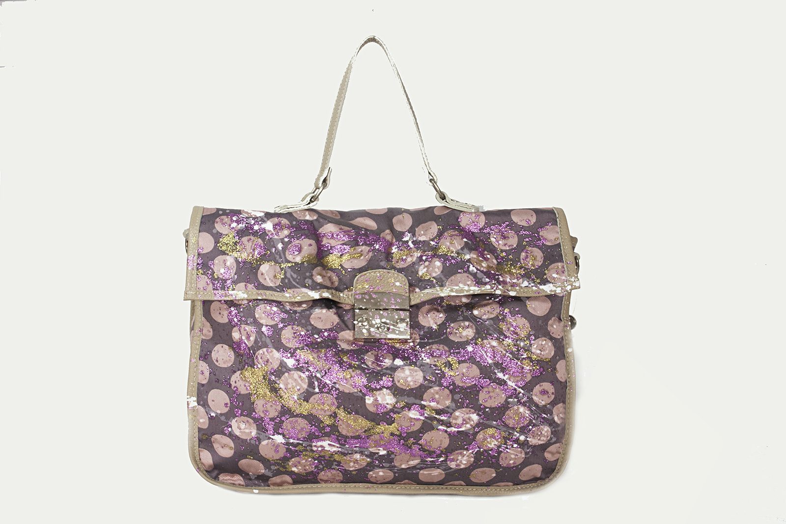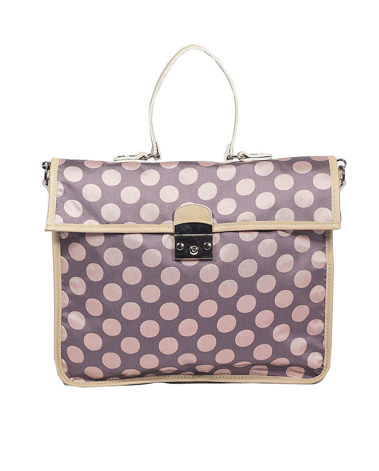 Borsa a cartella in jaquard a pois e vera pelle. Tracolla regolabile e removibile, fodere interne a contrasto personalizzate con doppia tasca porta cellulare in pelle e tasca con zip