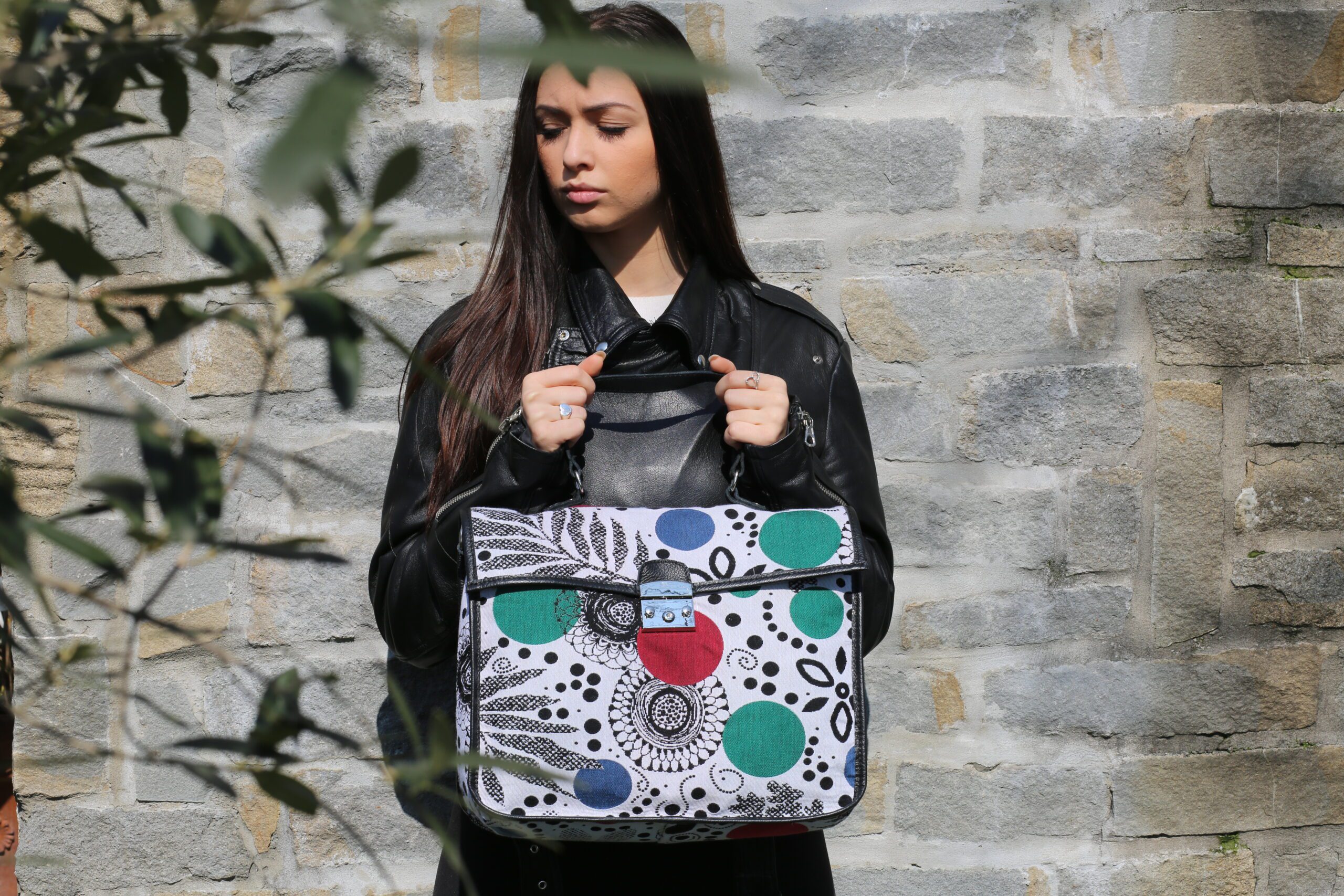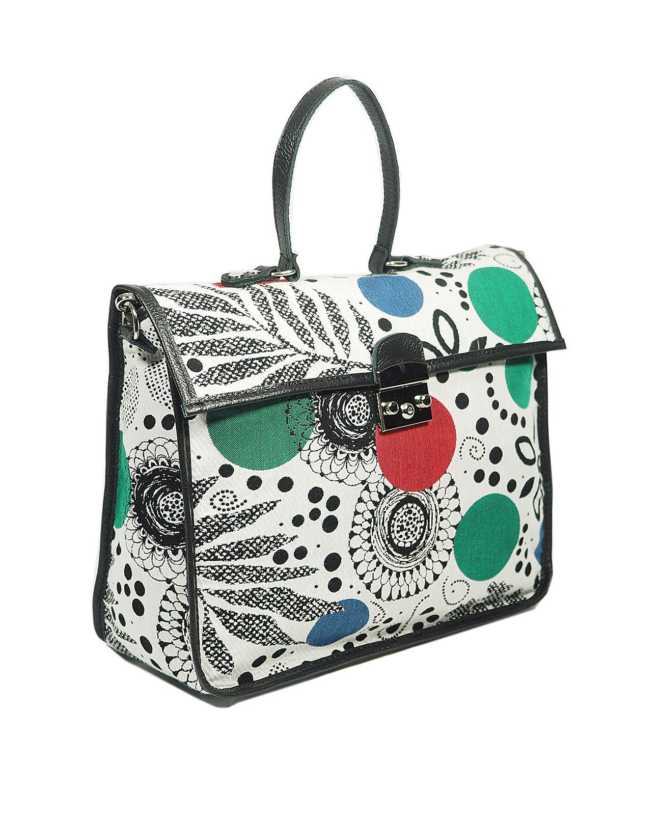 Borsa a cartella in jaquard floreale e vera pelle, tracolla regolabile e removibile, fodere interne a contrasto personalizzate con doppia tasca portacellulare in pelle e tasca con zip. Chiusura a girello, metalli in nickel. Misure: LHW cm: 38x30x15
