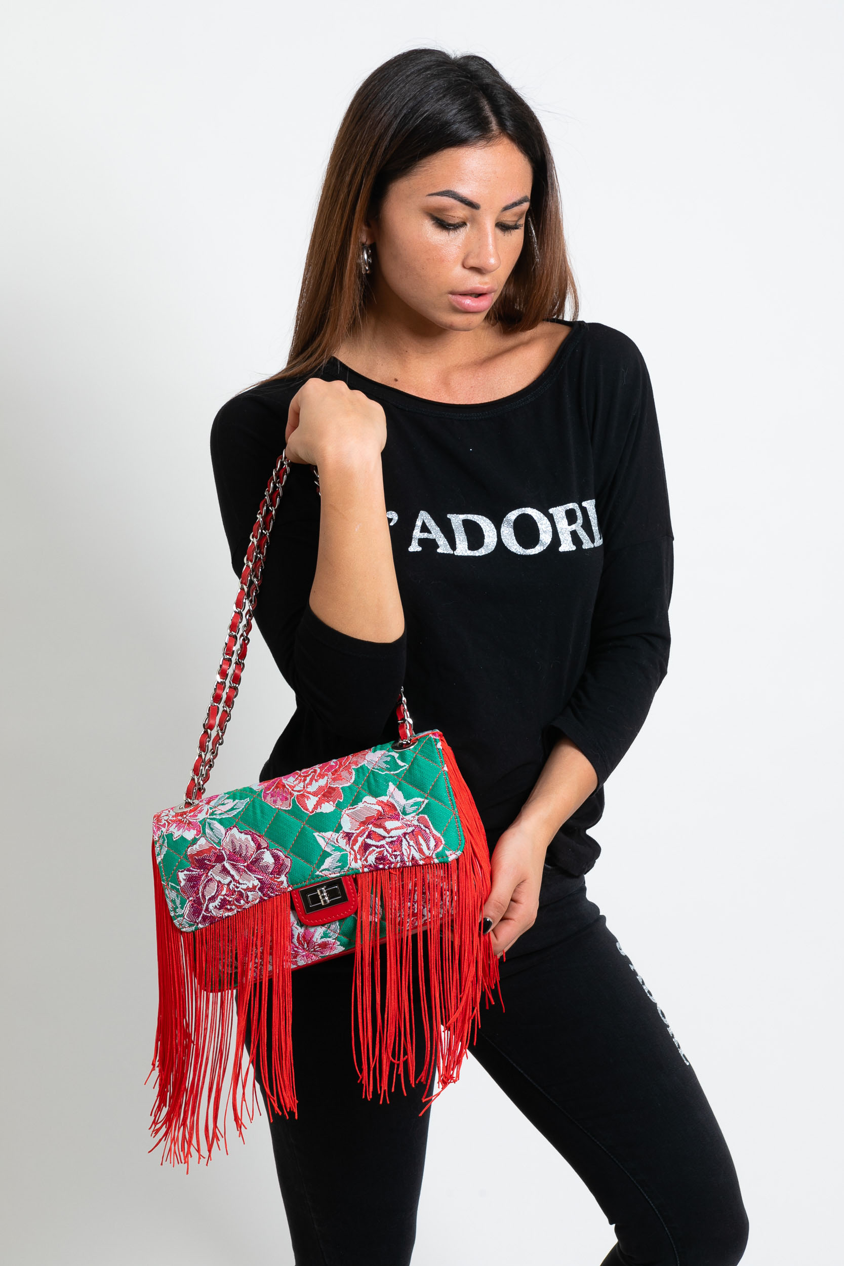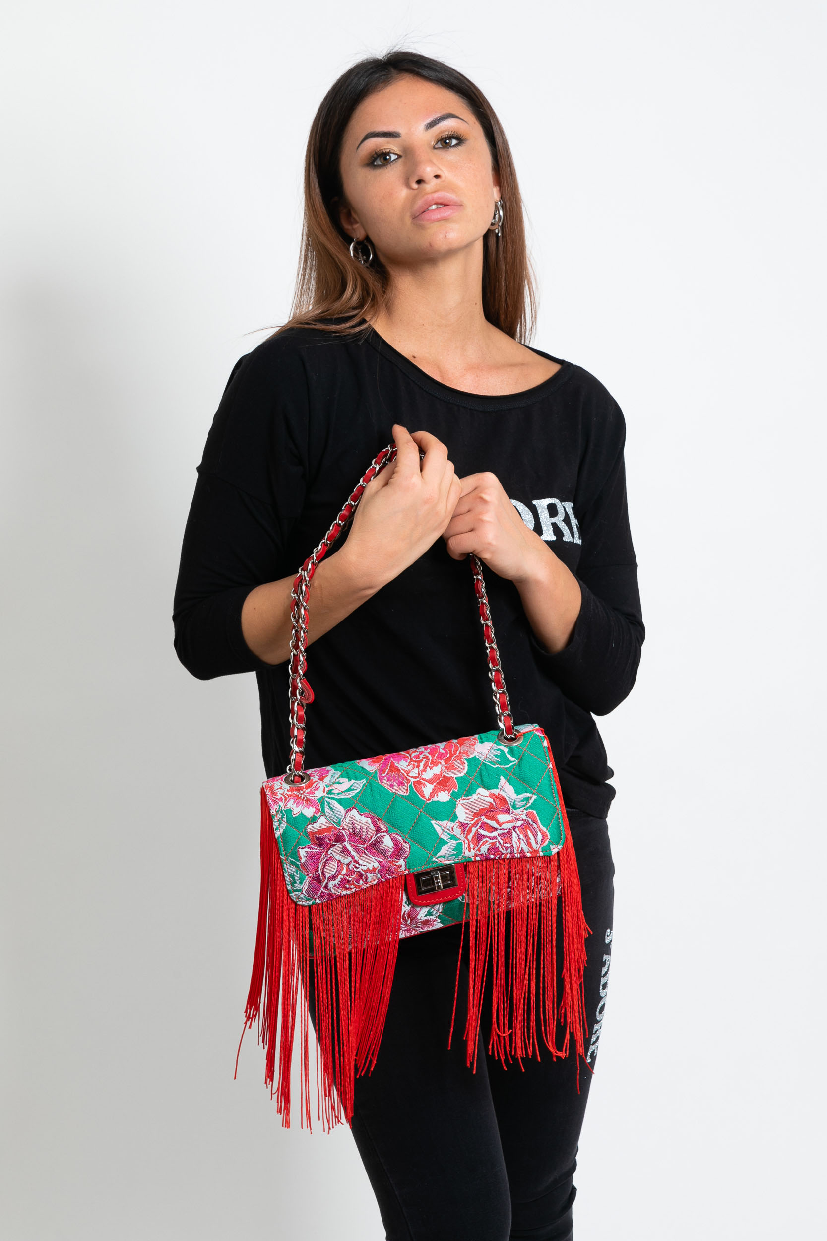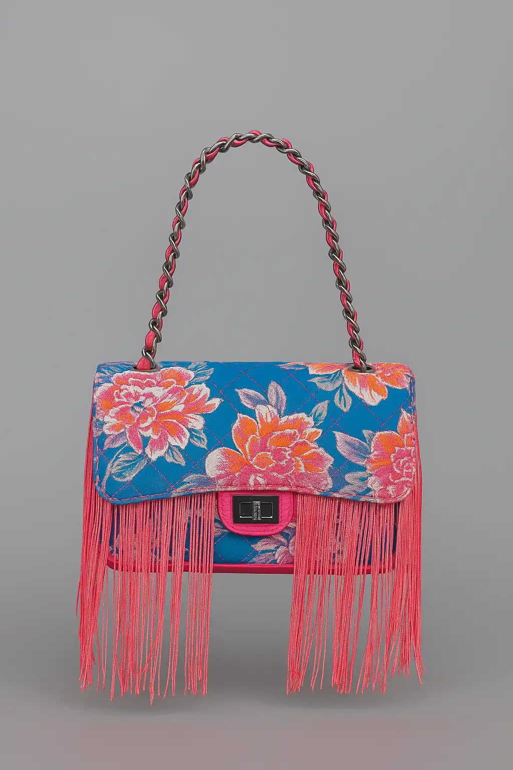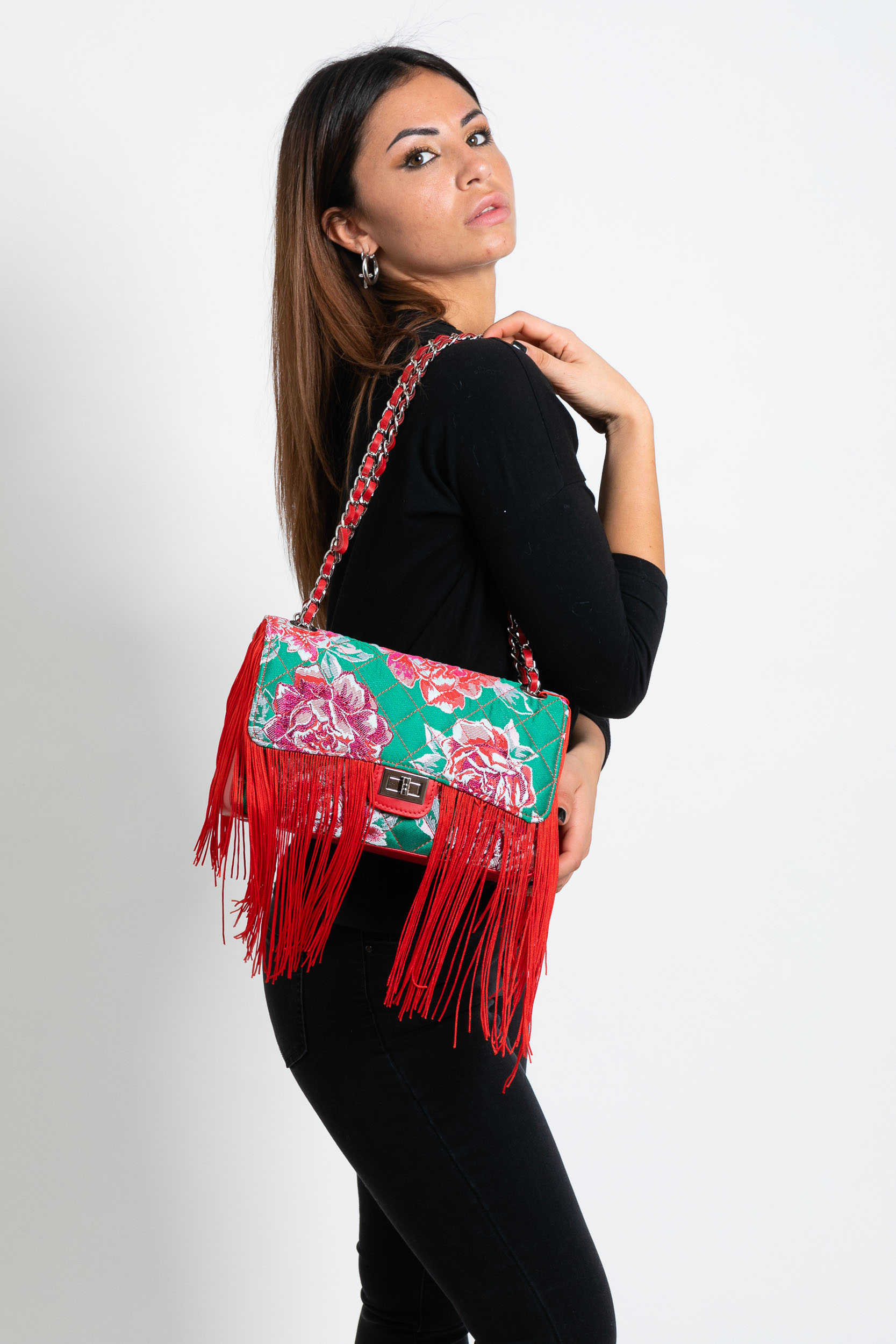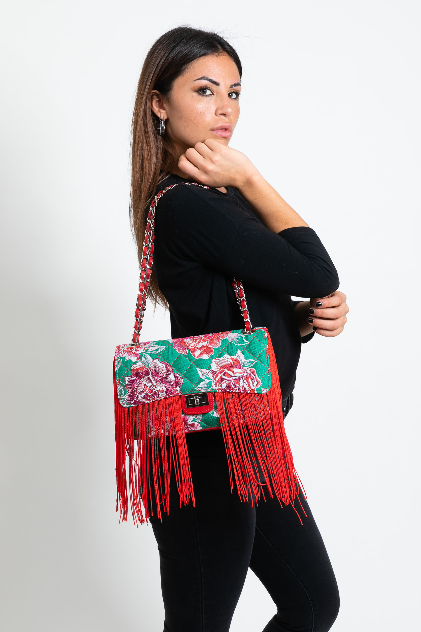 Questa borsa con frange nasce da un mix ricco e materico: tessuto damascato luminoso, vera pelle e rifinitura trapuntata che le dona struttura e carattere. Le frange in passamaneria creano un movimento scenografico e valorizzano ogni outfit, mentre la tracolla intrecciata in pelle e metallo aggiunge un dettaglio sofisticato e resistente.