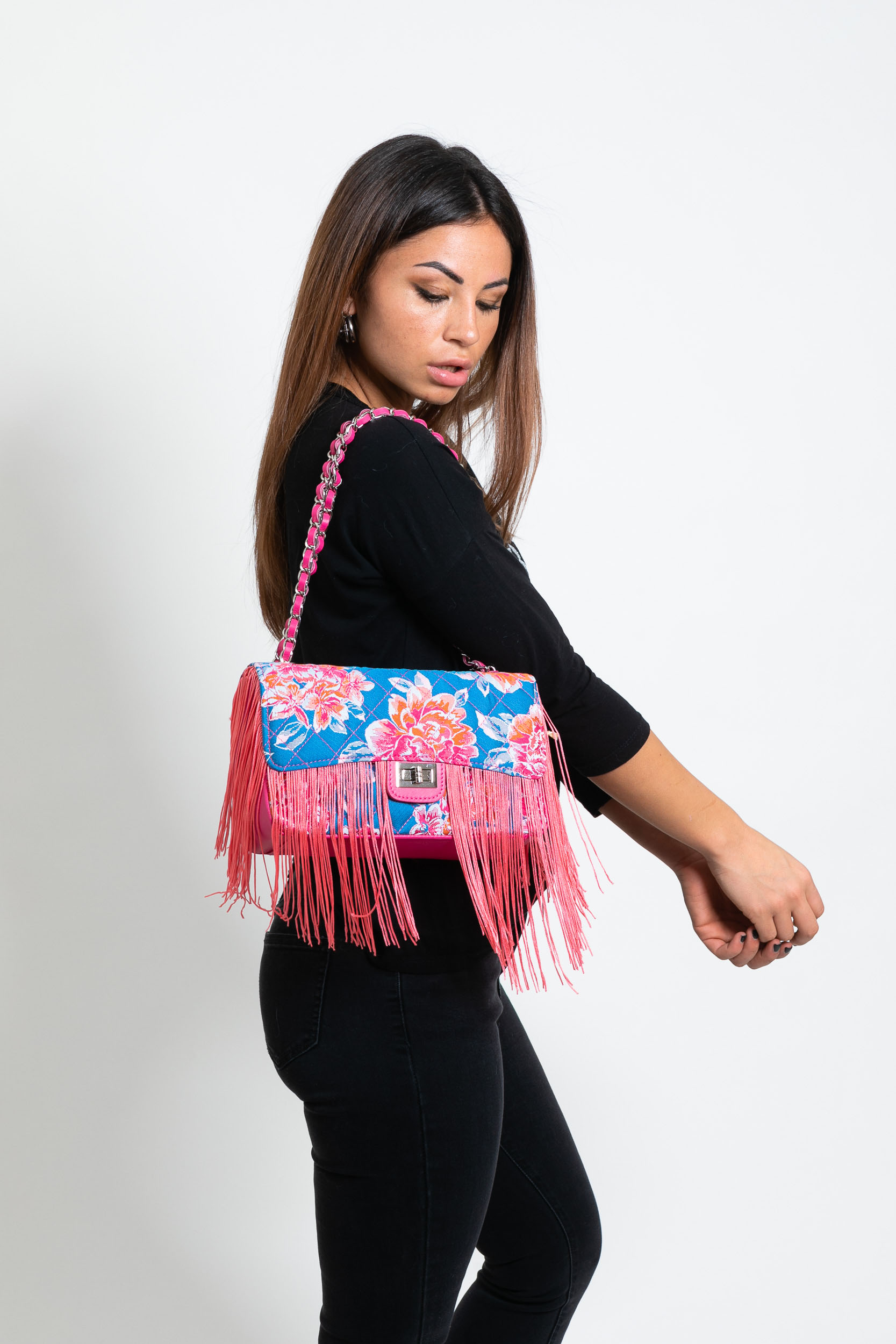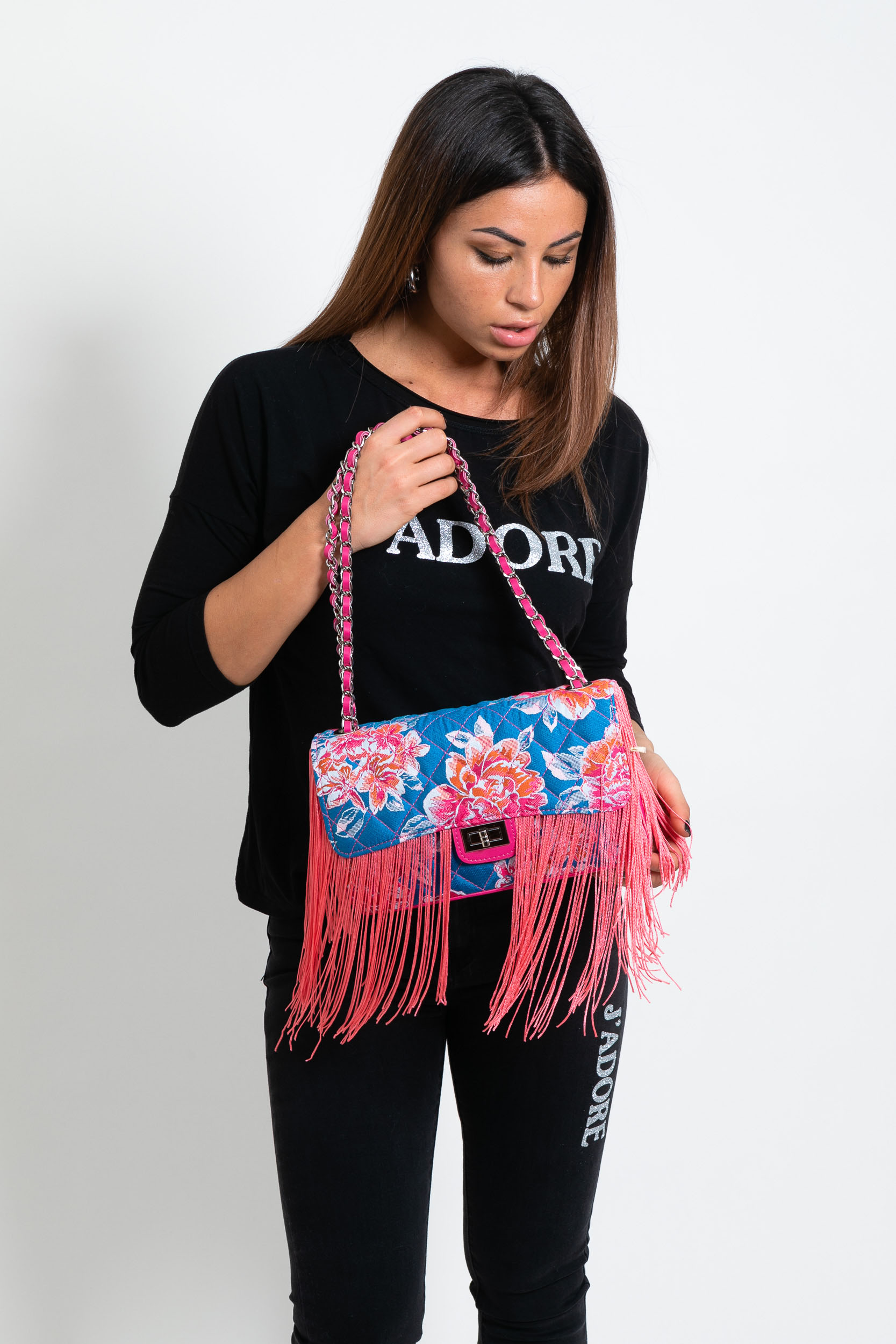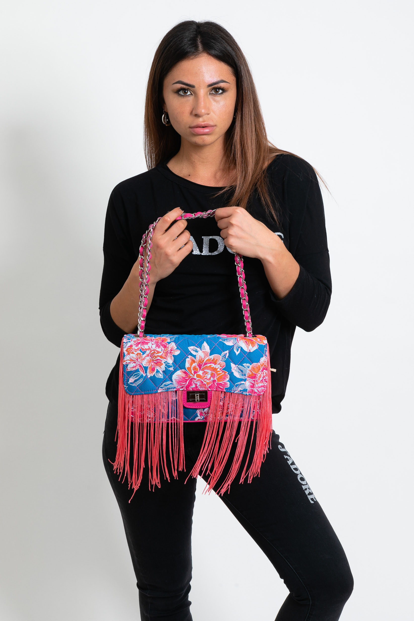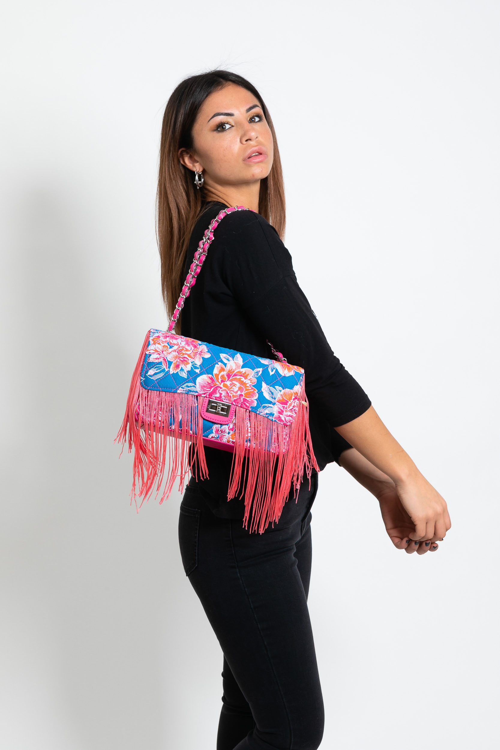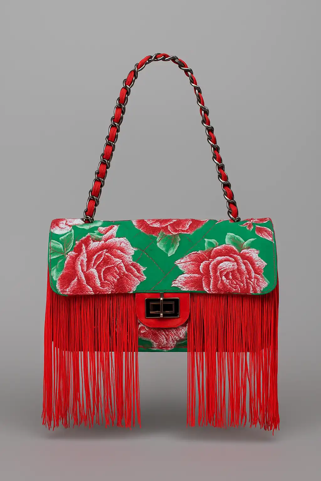 Questa borsa con frange nasce da un mix ricco e materico: tessuto damascato luminoso, vera pelle e rifinitura trapuntata che le dona struttura e carattere. Le frange in passamaneria creano un movimento scenografico e valorizzano ogni outfit, mentre la tracolla intrecciata in pelle e metallo aggiunge un dettaglio sofisticato e resistente.