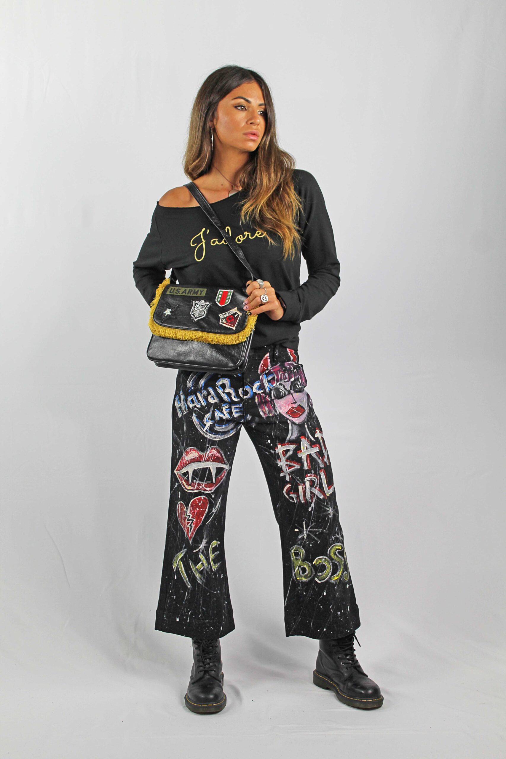 Ogni borsa è realizzata partendo da materiali upcycled di alta qualità, in particolare da vere borse militari originali. Il nostro processo artigianale ridona nuova vita a questi pezzi, arricchendoli con decorazioni in strass e passamanerie per una creazione unica e rispettosa dell’ambiente. Realizzata in vera pelle militare, ogni borsa è un pezzo unico grazie alla decorazione artigianale che include dettagli in strass e passamanerie. Il design pratico e la qualità dei materiali la rendono ideale per ogni occasione, dal lavoro alle serate più casual. Con il suo ampio scomparto e le tasche interne, è perfetta per organizzare gli oggetti personali con stile e comodità. Indossala con fiducia e aggiungi un tocco di classe e personalità al tuo look quotidiano.