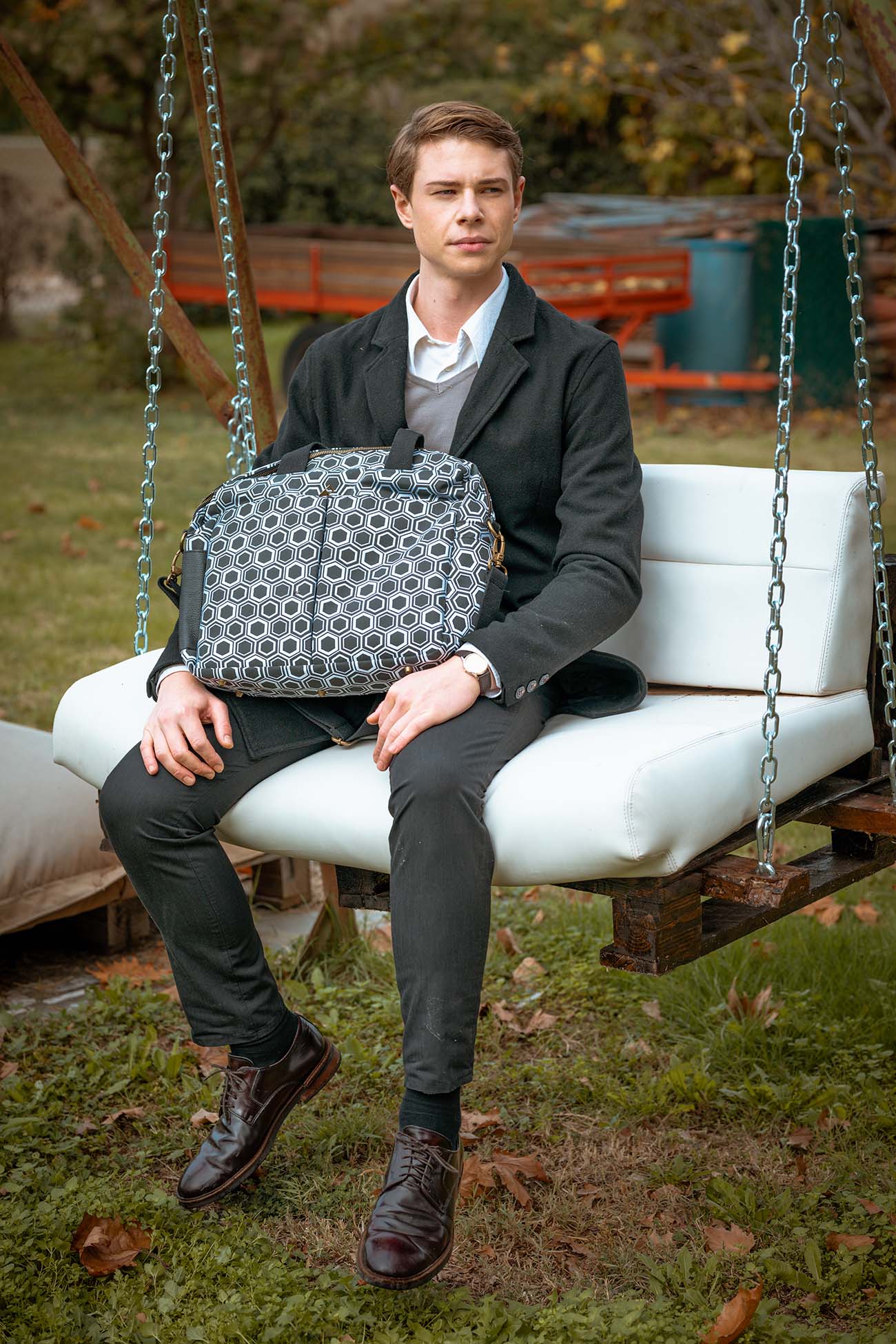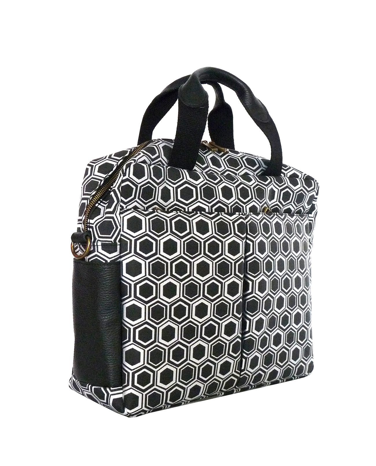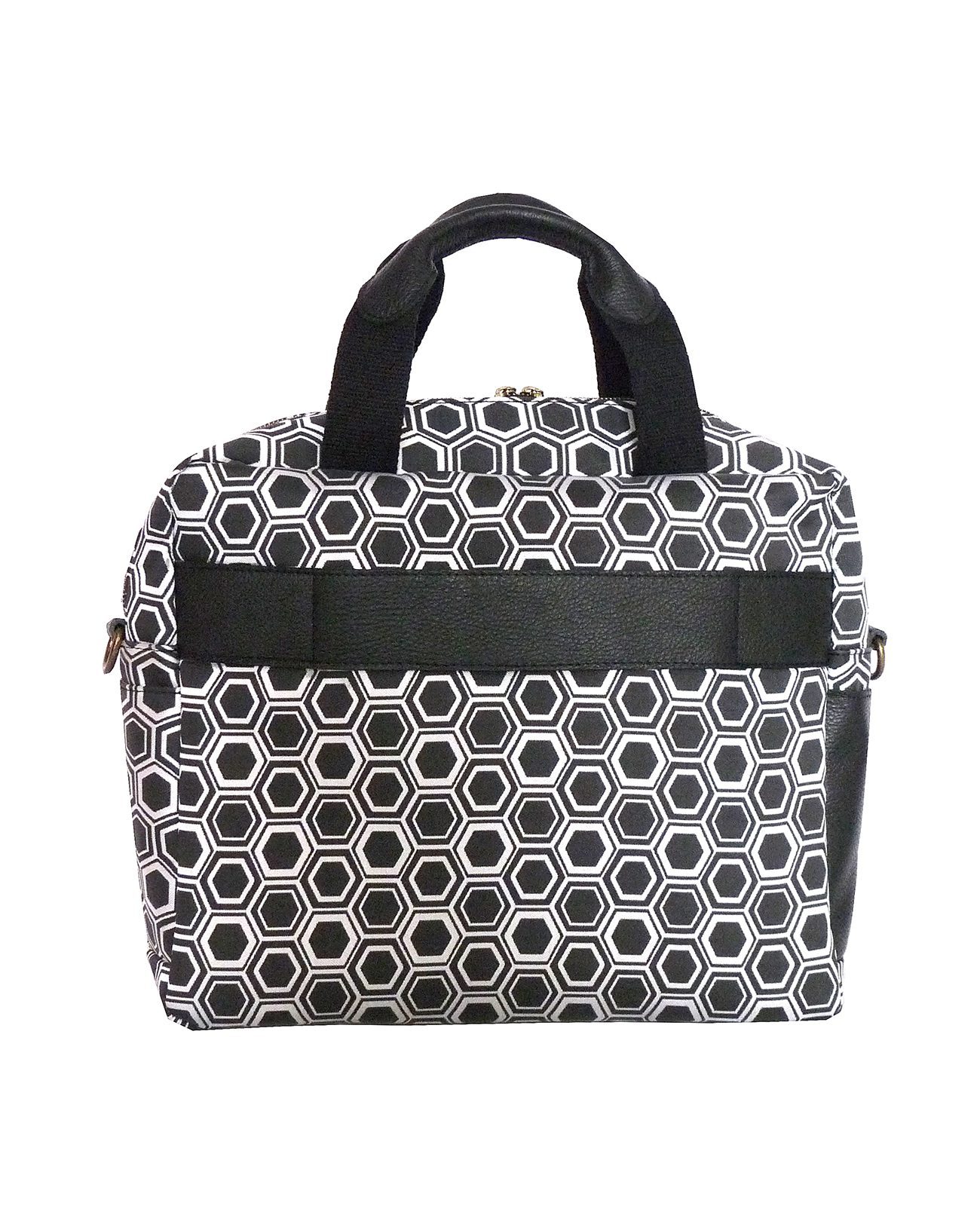 Cartella porta pc in Jaquard e vera pelle con tasche esterne. Fodere interne a contrasto personalizzate, scomparto rigido porta Ipad e tasca con zip, chiusura a cerniera, bretella in pelle per inserimento cartella sulla barra di trazione del trolley. Tracolla removibile e regolabile, metalli in ottone invecchiato.