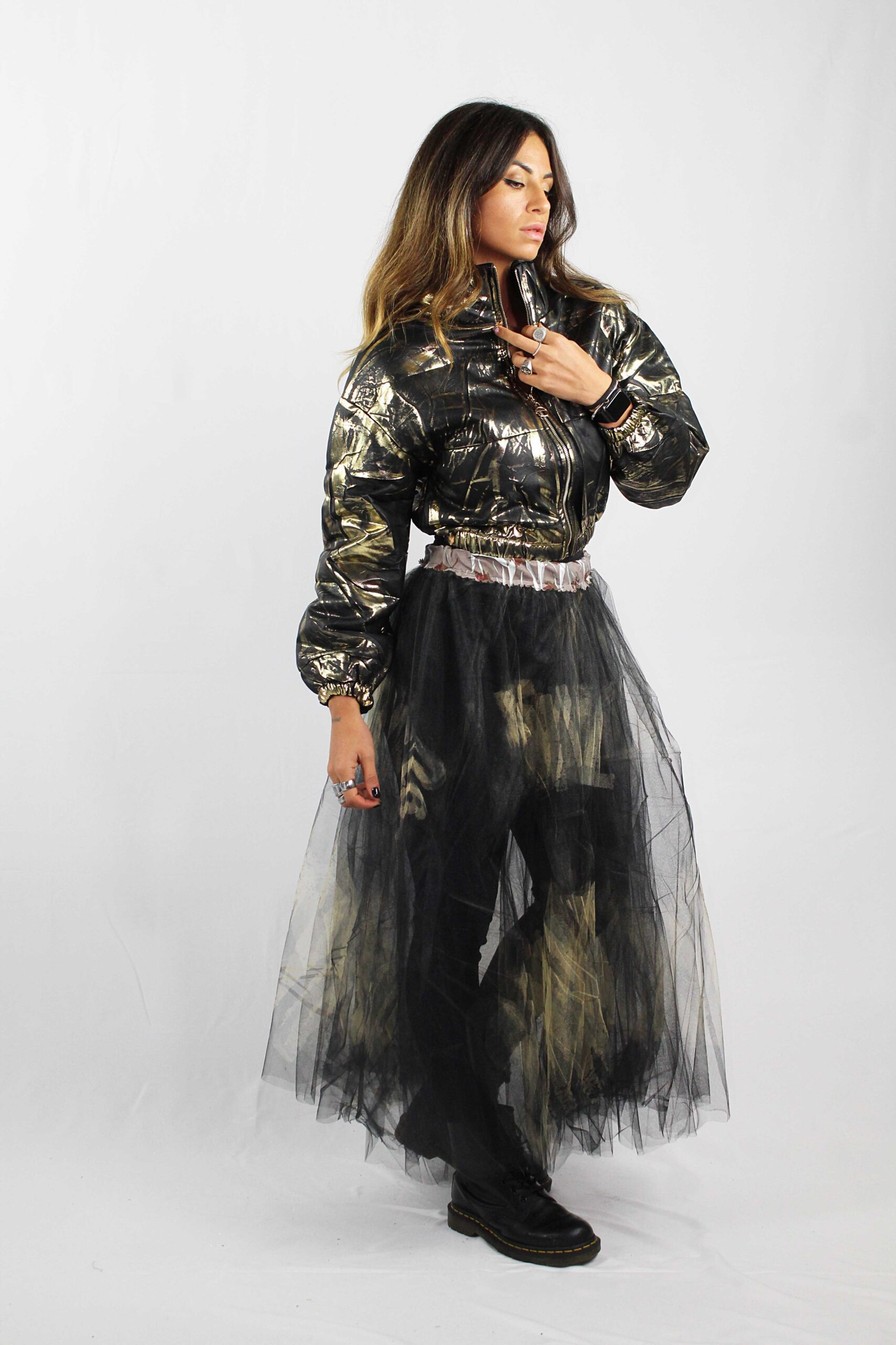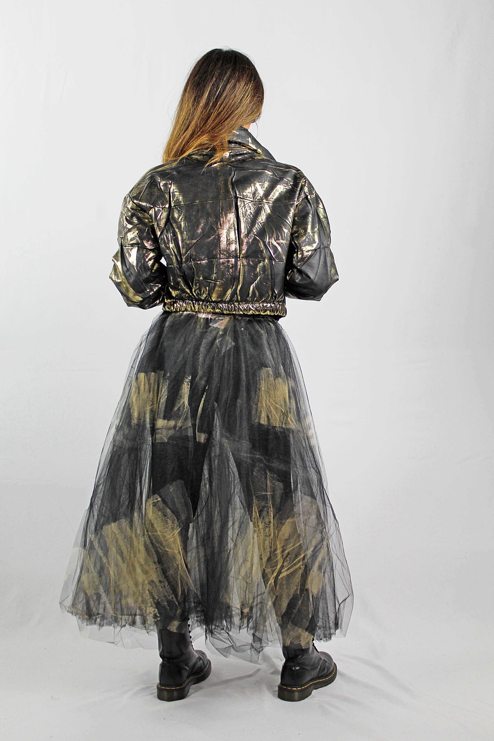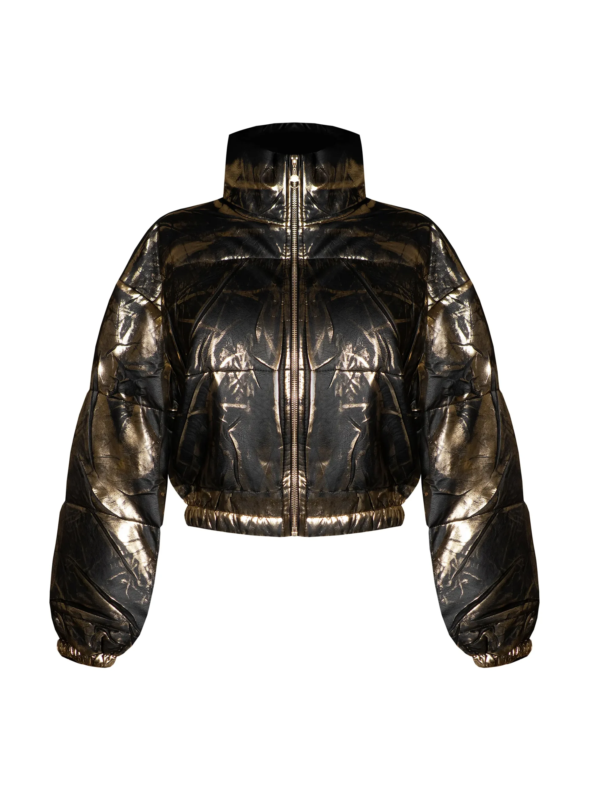 Giacca Bomber  laminato a mano con oro. Trapuntato ed imbottito realizzato in ecopelle con collo alla coreana chiusura a zip.