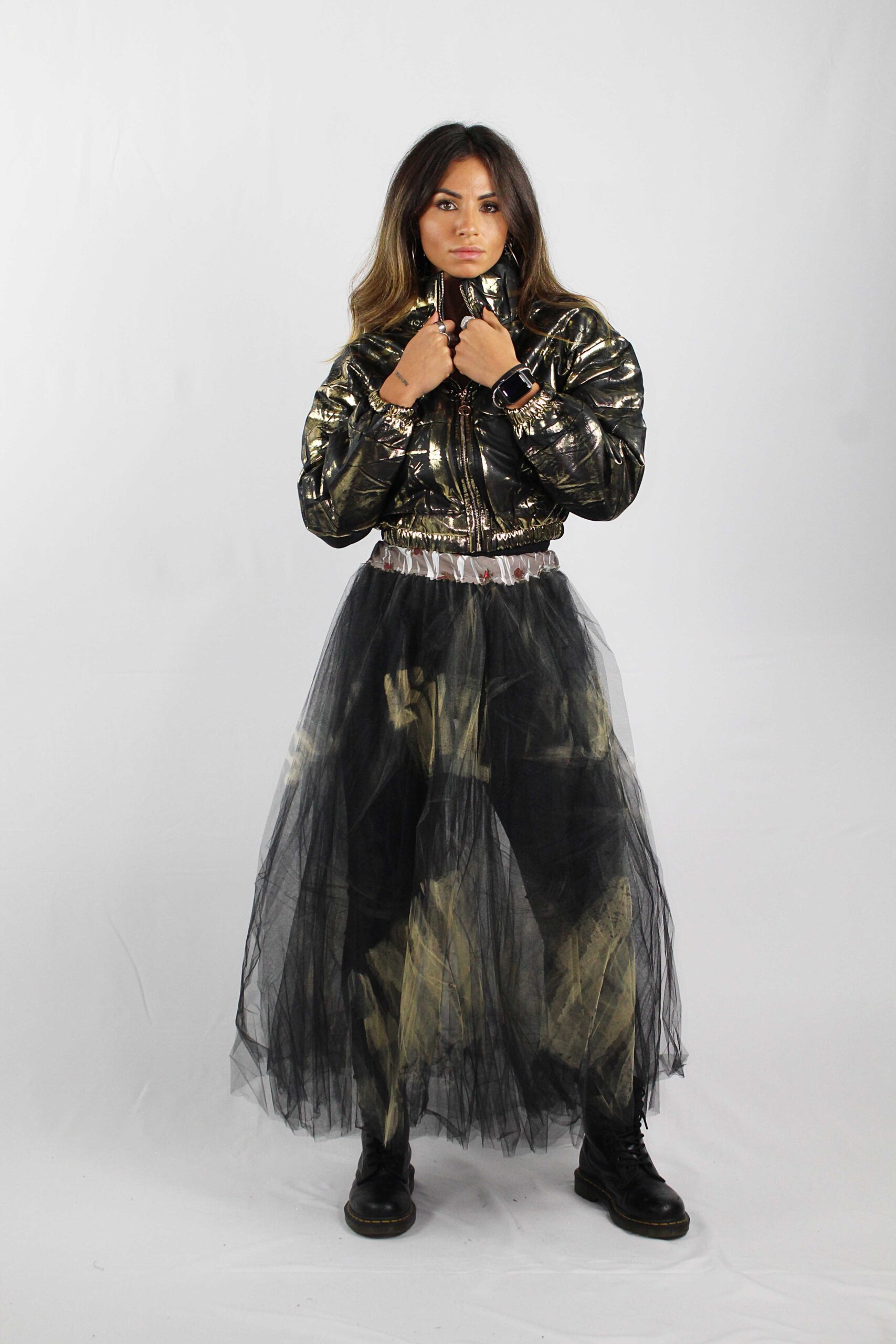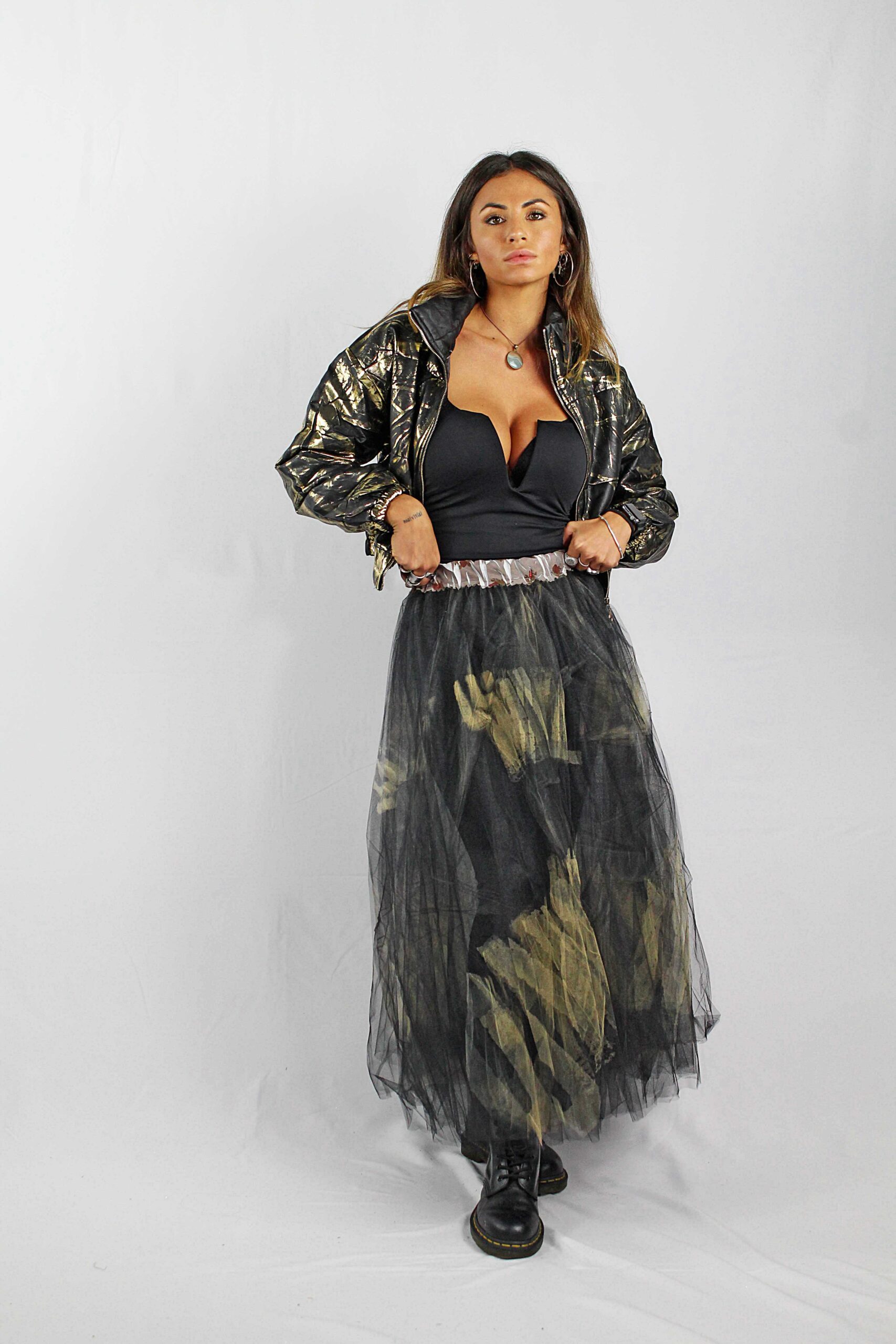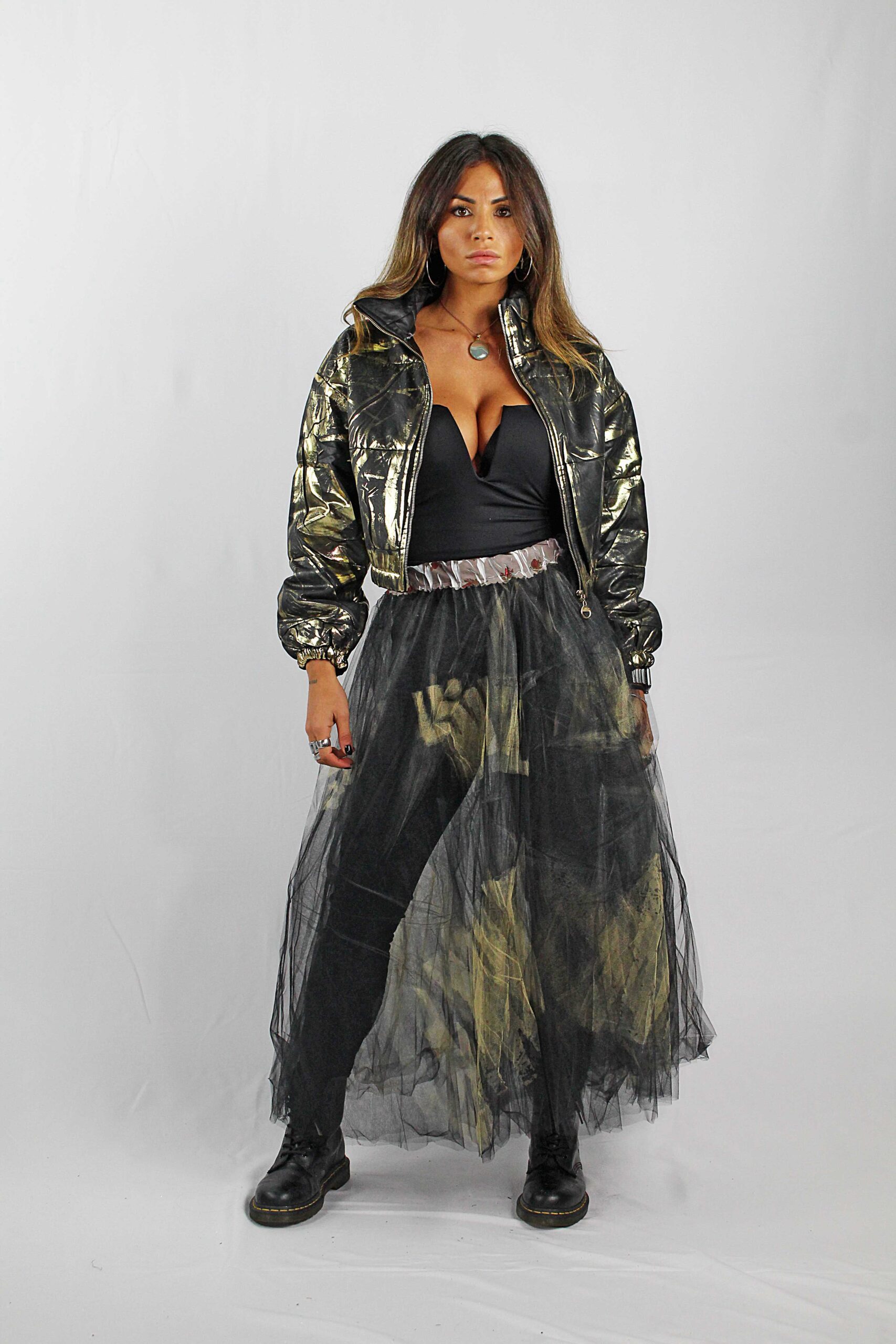 Giacca Bomber  laminato a mano con oro. Trapuntato ed imbottito realizzato in ecopelle con collo alla coreana chiusura a zip.