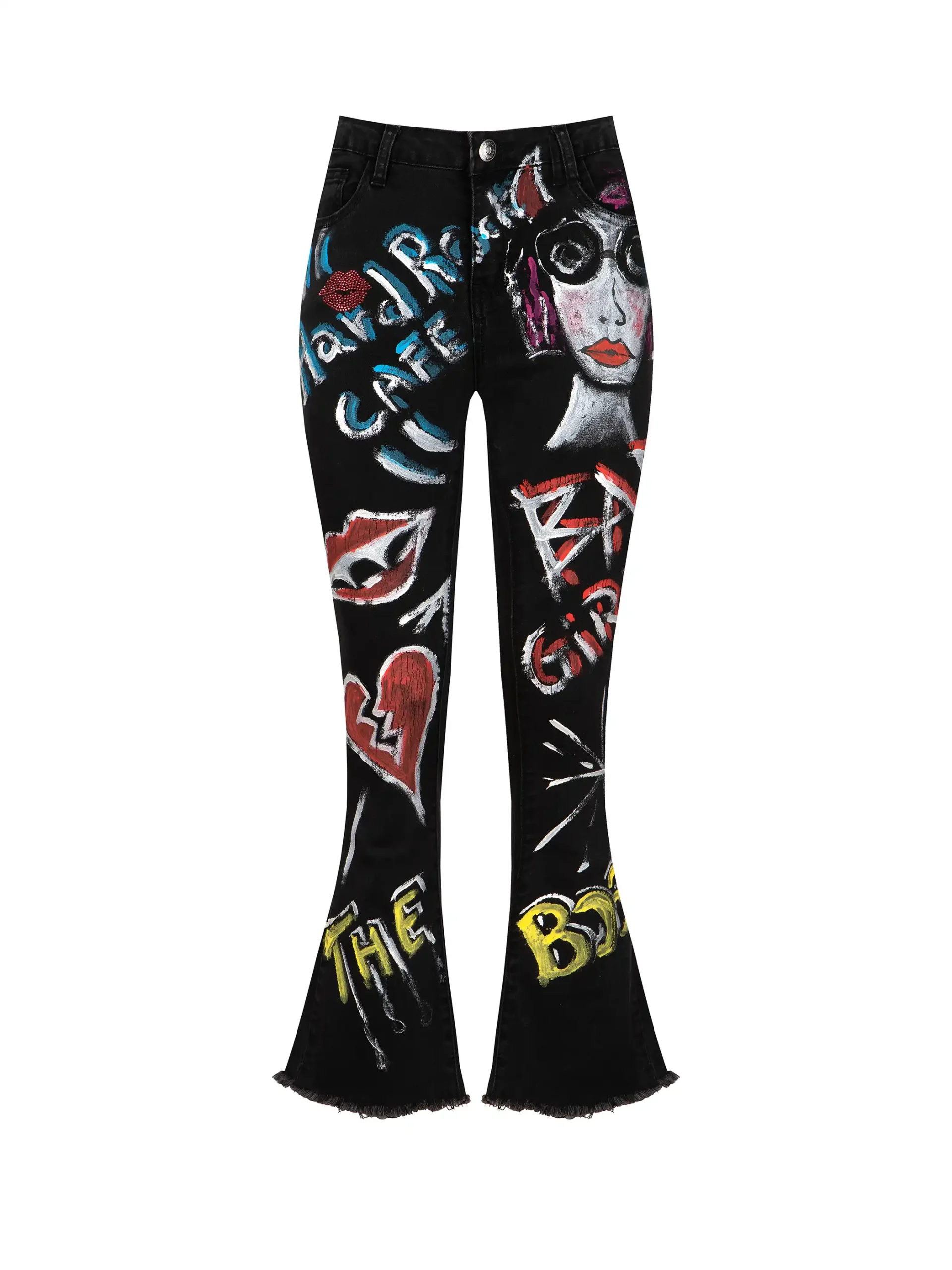 Questo jeans apiedinudinelparco è un pezzo d’arte da indossare, realizzato a mano con tecnica pittorica su denim nero elasticizzato.
