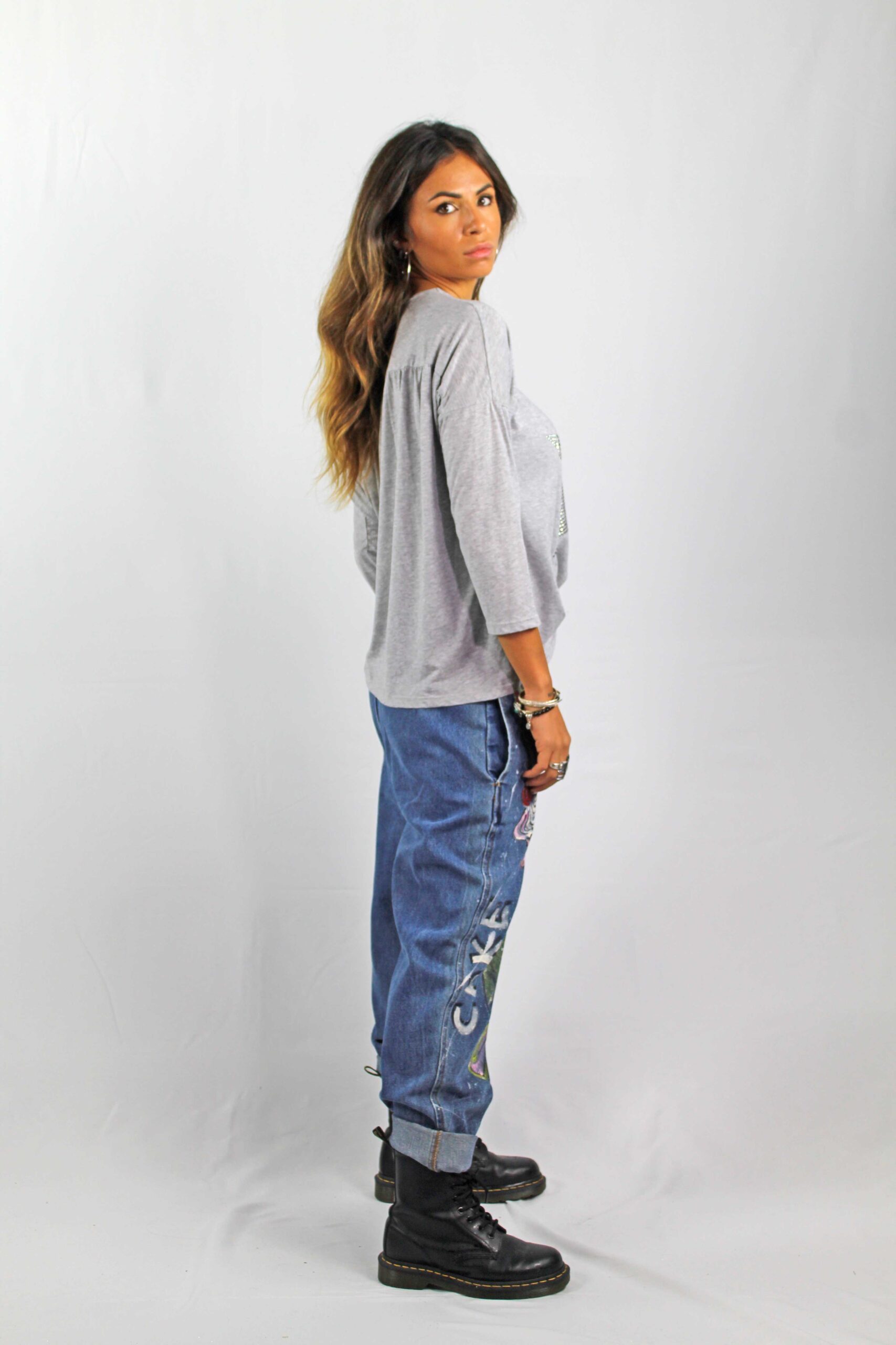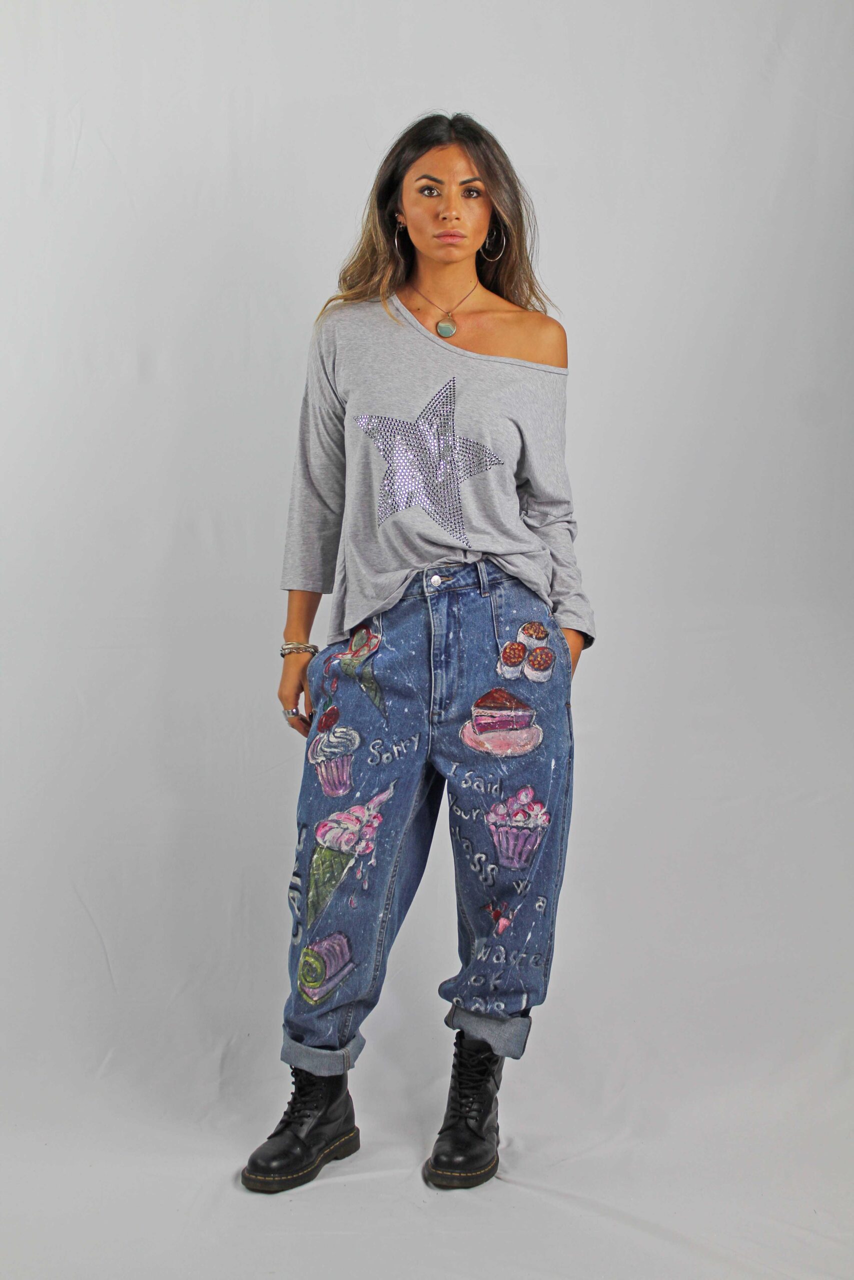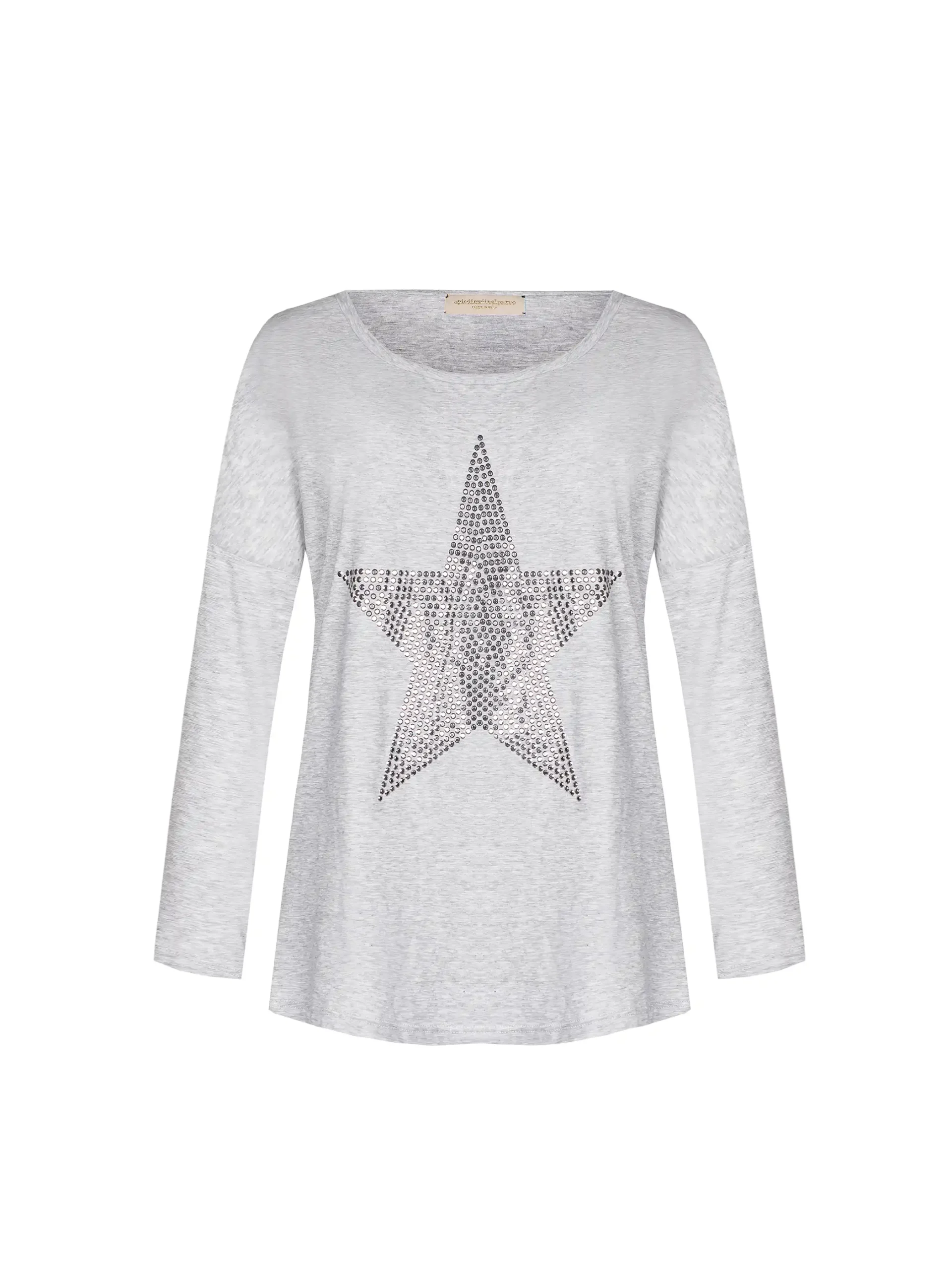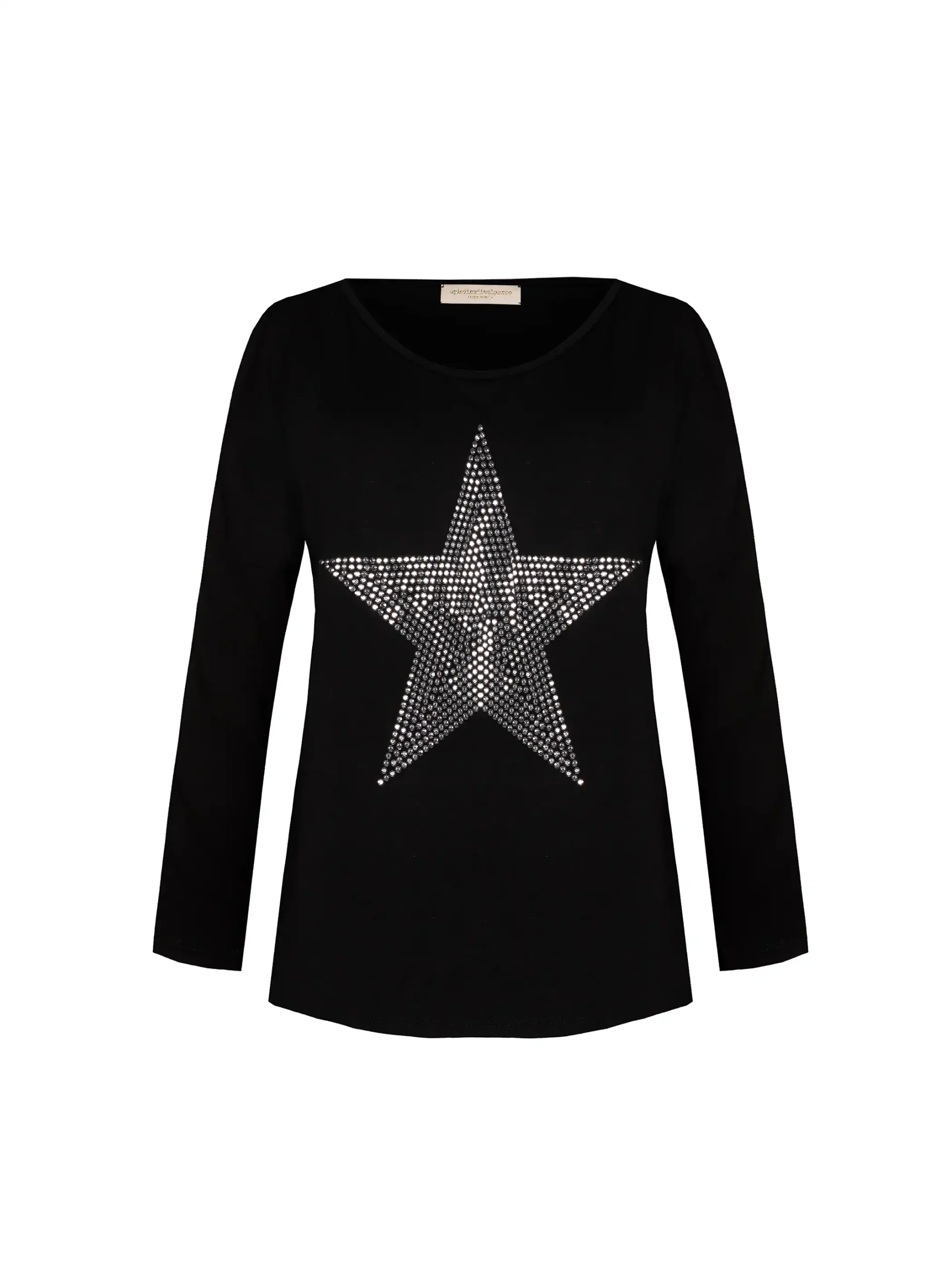Aggiungi un tocco di stile unico al tuo guardaroba con questa maglietta da donna a manica lunga, perfetta per outfit casual chic e sotto giacca. L’ampio scollo a barchetta con spalle cadenti, unisce femminilità e comfort. La maxi stella decorata con borchie argento dona carattere al capo, mentre il carrè plissettato sulla schiena aggiunge movimento e una vestibilità ottimale.