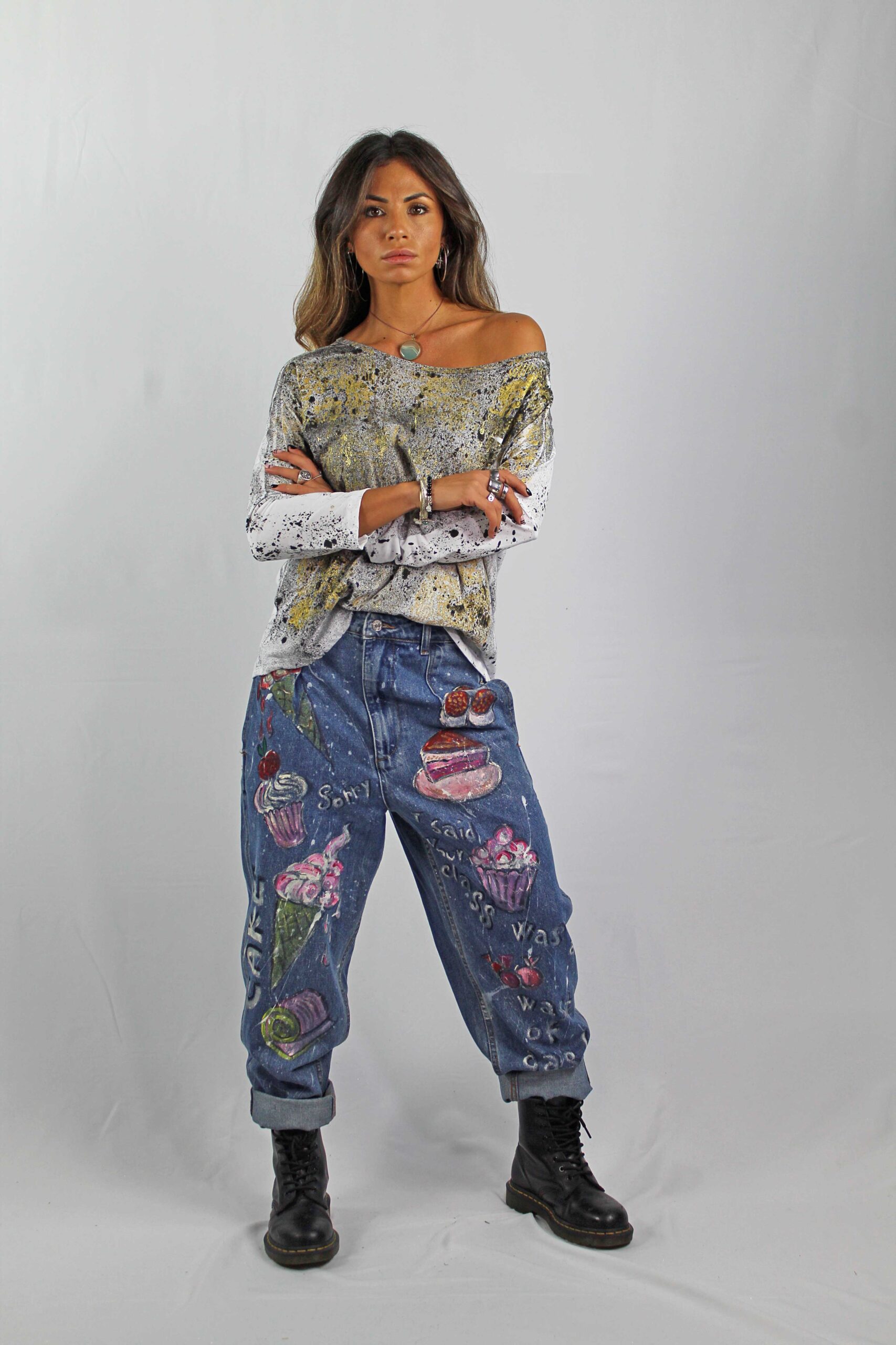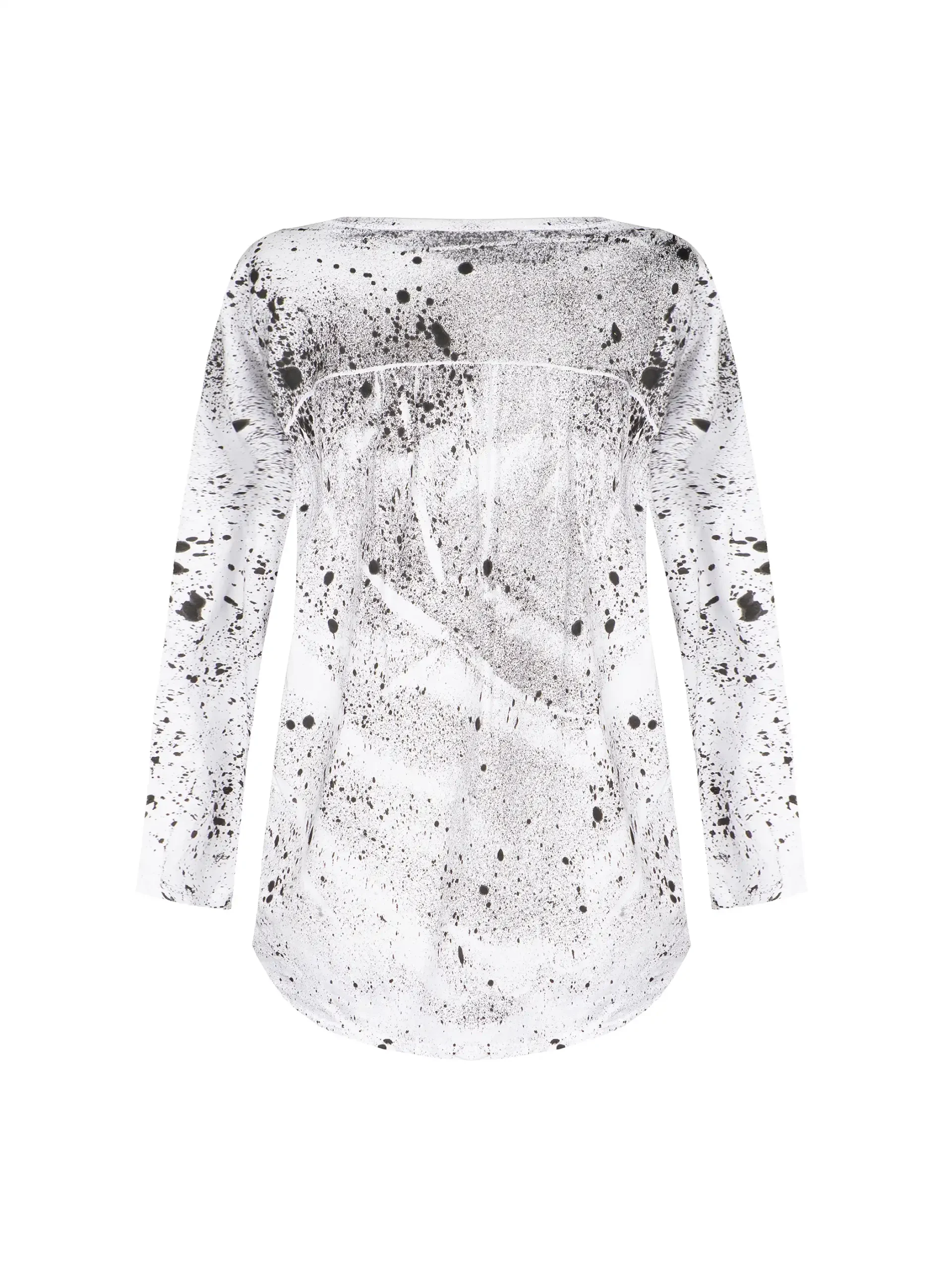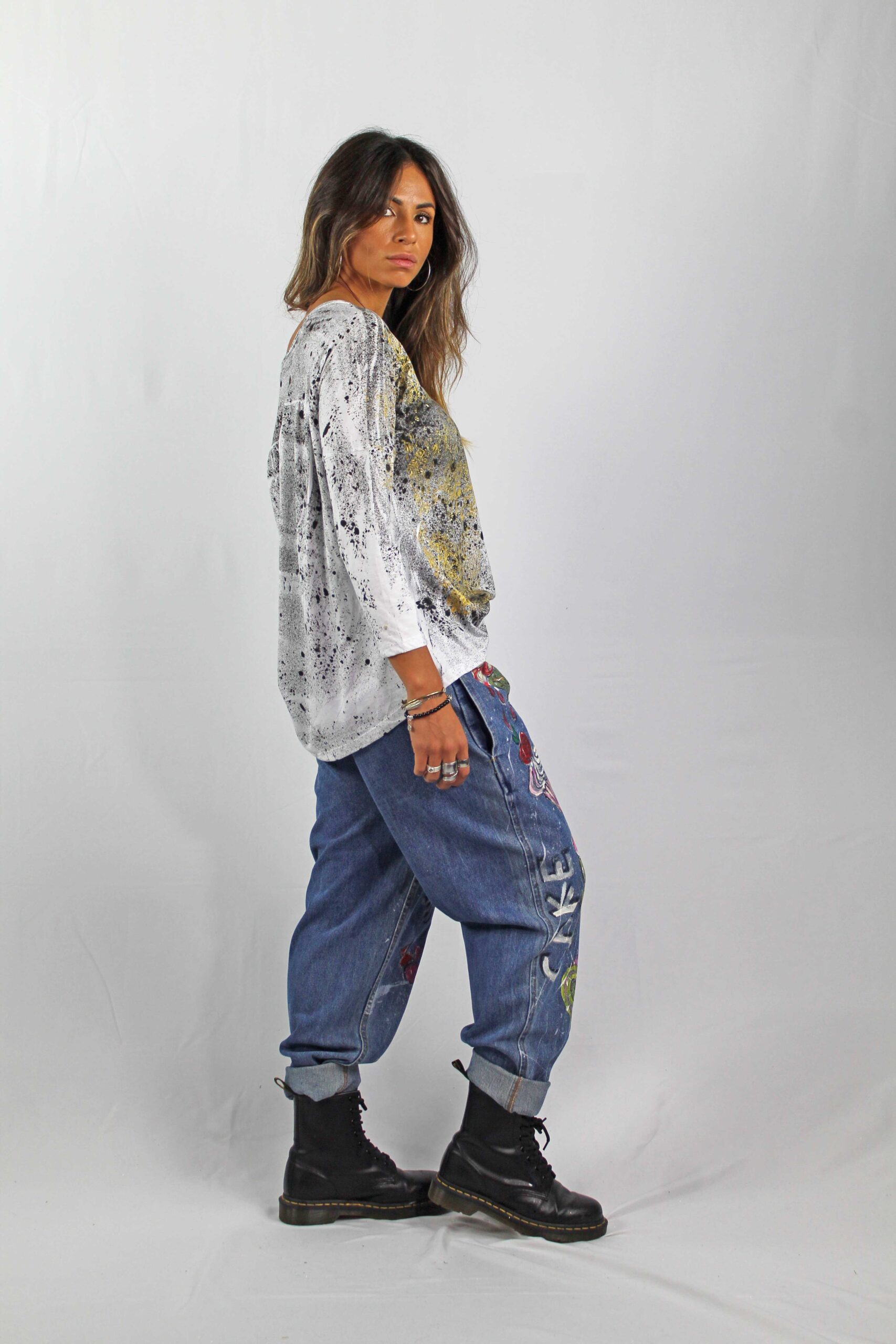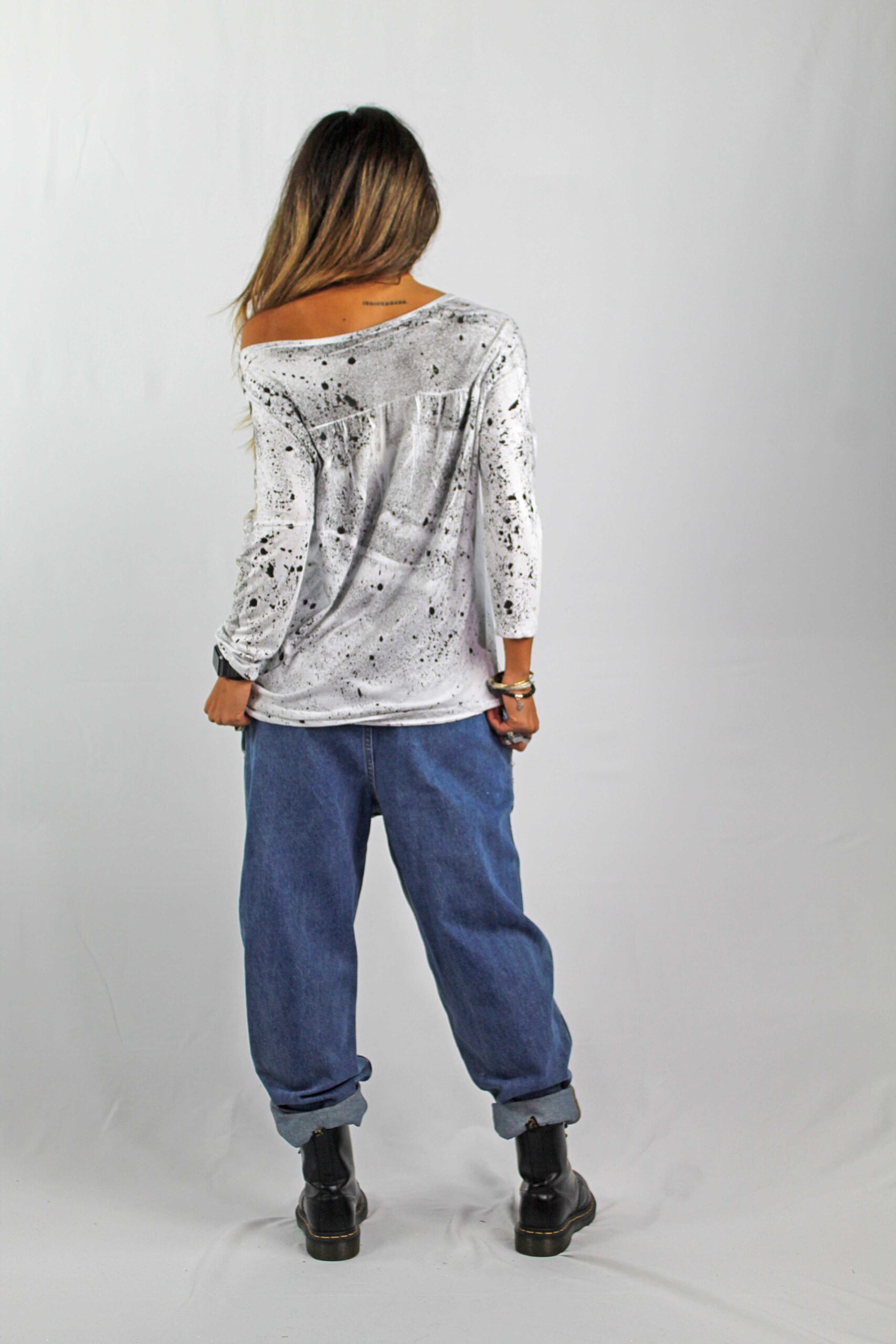 Aggiungi un tocco di stile unico al tuo guardaroba con questa maglietta da donna a manica lunga, perfetta per outfit casual chic in primavera e autunno. Con un ampio scollo a barchetta e spalle cadenti, unisce femminilità e comfort. Dipinta a mano con effetti barocco dorati e nero, la maxi stella decorata con borchie argento dona carattere al capo, mentre il carrè plissettato sulla schiena aggiunge movimento e una vestibilità ottimale.